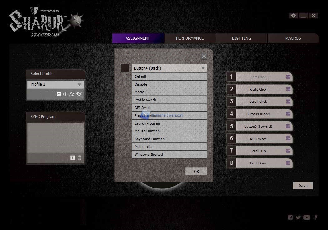 Il software presenta quattro Menù principali. Il primo da cui partiamo è ‘’Assignment’’ che come fa intuire la parola indica la possibilità di modificare gli 8 tasti totali del mouse con altre funzioni. Come sempre potremo agire su funzioni multimediali, desktop o come sempre creare e subito dopo assegnare una data macro. In questo Menù avremo la possibilità di salvare sino a 5 profili con diversi settaggi da richiamare all’occorrenza impostando un tasto dedicato. Infatti come pensavo il singolo tasto presente sul mouse nella parte superiore sarà adibito al cambio dei DPI o per meglio dire Step DPI. Non manca in questo Menù anche la possibilità di ‘’legare’’ un dato profilo ad un programma in modo tale da avere subito caricato quel profilo quando avremo lanciato il gioco o programma.