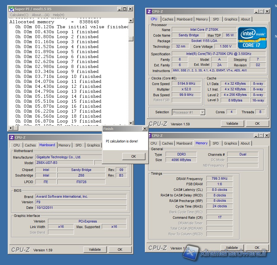 Abbiamo condotto dei test cercando di trovare la massima frequenza benchabile, ossia una frequenza tale che ci permetteva di superare il noto software di benchmark SuperPI. Come si può vedere dalle schermate seguenti abbiamo eseguito la modalità 1M prima per trovare la massima frequenza operativa della cpu e poi infine cercando di stabilire se vi sono stati miglioramenti sulla massima frequenza di bclk e ram rispetto alla cpu i7-2600K. Il sistema usato per il raffreddamento della cpu è di tipo water cooling: