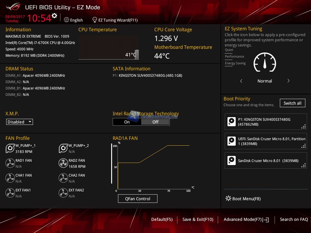 Per passare alla modalità ‘’Advanced Mode’’ ci basterà premere il tasto F7. Fatto ciò ci troveremo di fronte ad un'interfaccia grafica stile ROG dei suoi BIOS UEFI. Al solito i Menù principali sono 8 e sono ‘’My Favorites’, ‘’Main’’, ‘’Extreme Tweaker’’, ‘’Advanced’’, ‘’Monitor’’, ‘’Boot’’, ‘’Tool’’, ed infine ‘’Exit’’. Nel primo Menù ovvero ‘’Main’’ avremo un riassunto sul tipo di processore installato e la quantità e frequenza attuale dei moduli RAM installati nonché altre informazioni base. Non manca la voce ‘’My Favorites’’ dove potremo salvare eventuali impostazioni e profili di OC.