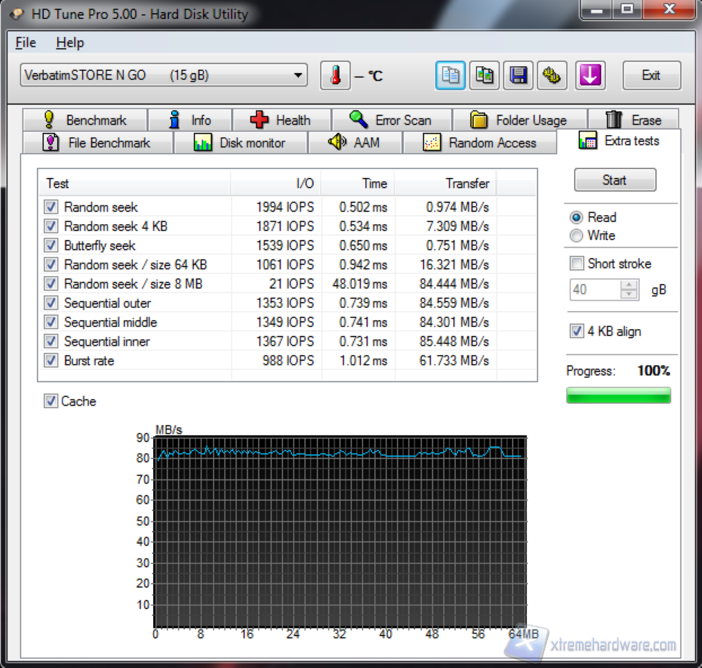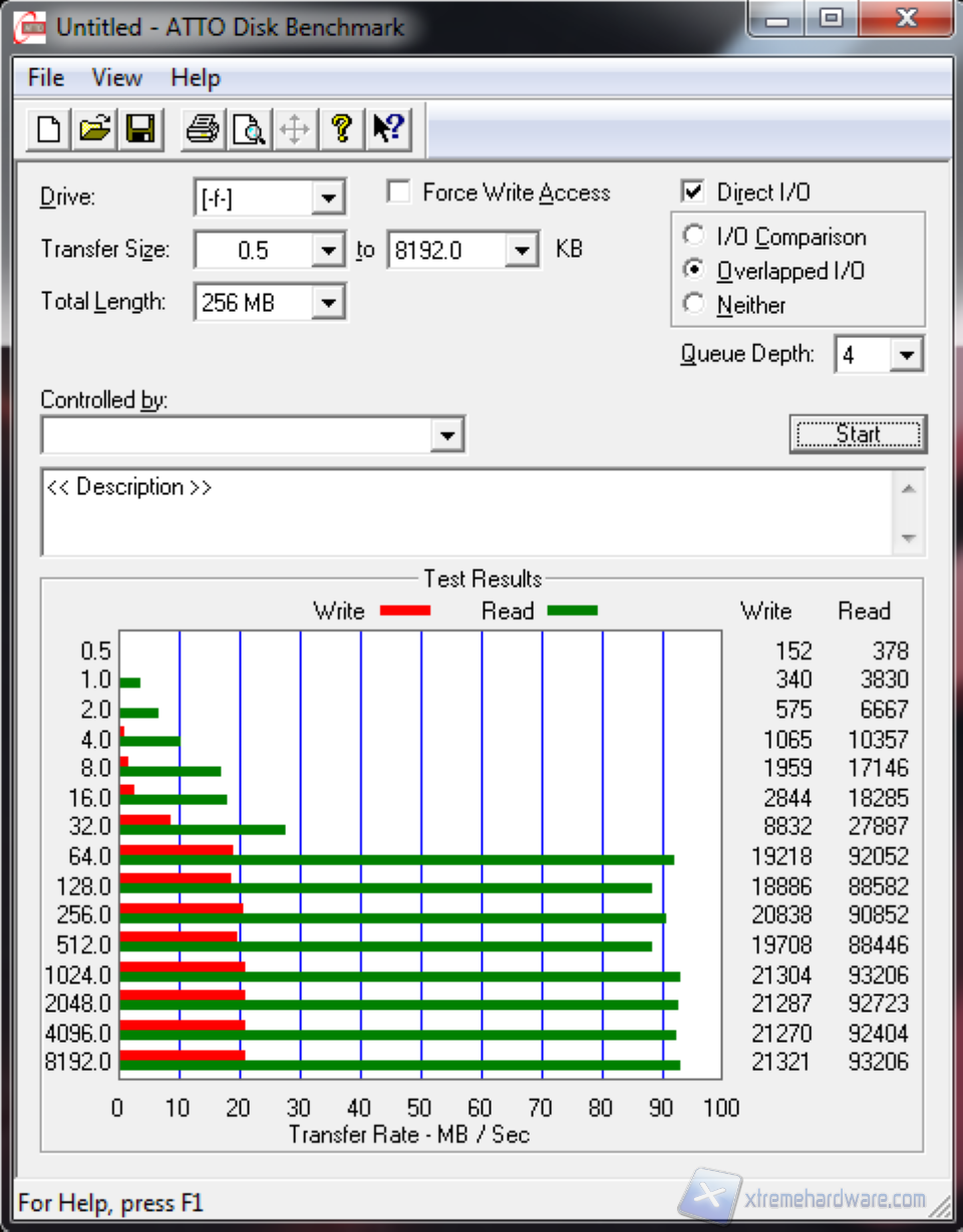 ATTO è il bench dove la nostra pennetta si comporta meglio, infatti in questo Bench raggiunge punte di 93-94MB/s in lettura e 21MB/s in scrittura.