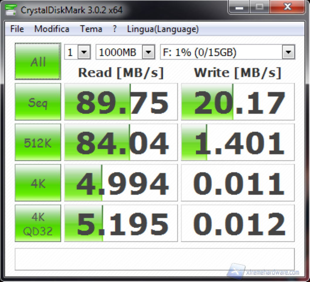 Prestazioni superiori rispetto a quanto dichiarato dalla casa, 90MB/s per la lettura e 20MB/s per la scrittura, non è una delle pennette più veloci che abbiamo mai provato sul nostro portale ma si difende bene.