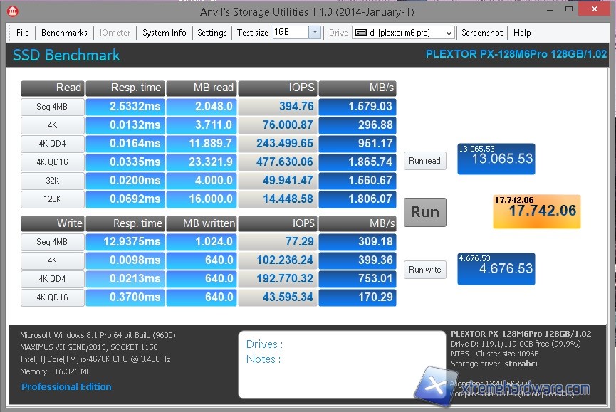 Questo nuovo bench introdotto nella nostra suite di test, chiamato Anvil's Storage Utilities, è pensato appositamente per gli SSD ed è in grado di testare i drive sotto ogni aspetto. I risultati ottenuti sono sempre molto elevati. Con lo stesso Benchmark abbiamo provveduto ad effettuare i test occupando lo spazio del drive, e possiamo notare che con il drive occupato al 100% le prestazioni sono rimaste praticamente invariate.